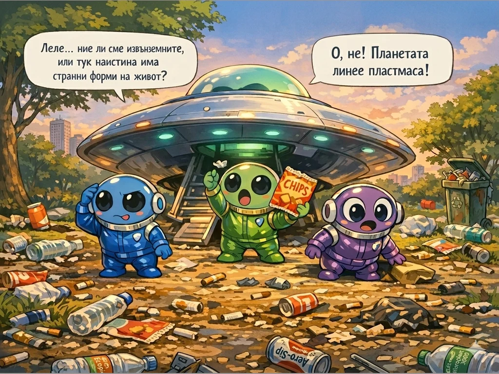 Ключови фрази: смешни извънземни чистят парк, забавен комикс за деня на Земята, хумористична еко сцена, карикатура за почистване на природата