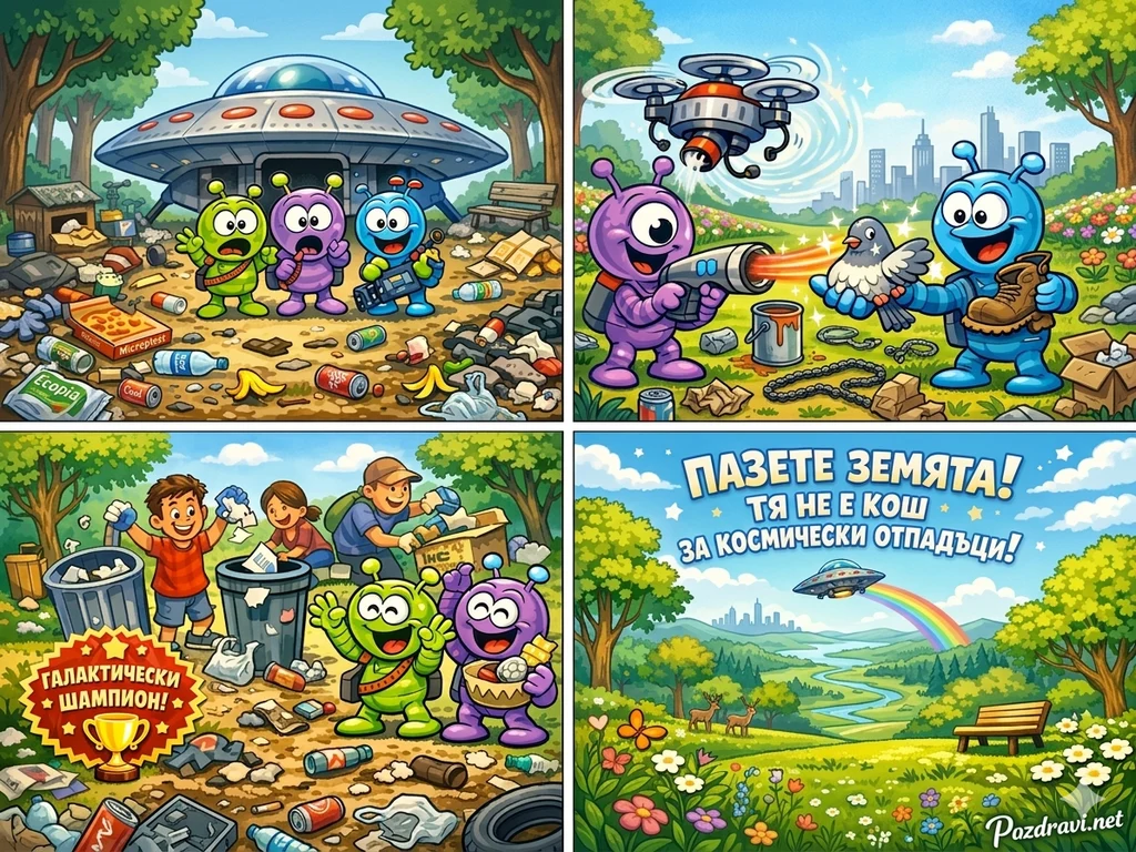 После хората се включват в почистването, а извънземните радостно аплодират дете, което хвърля хартийка в кошчето и получава стикер с надпис 'Галактически шампион'.