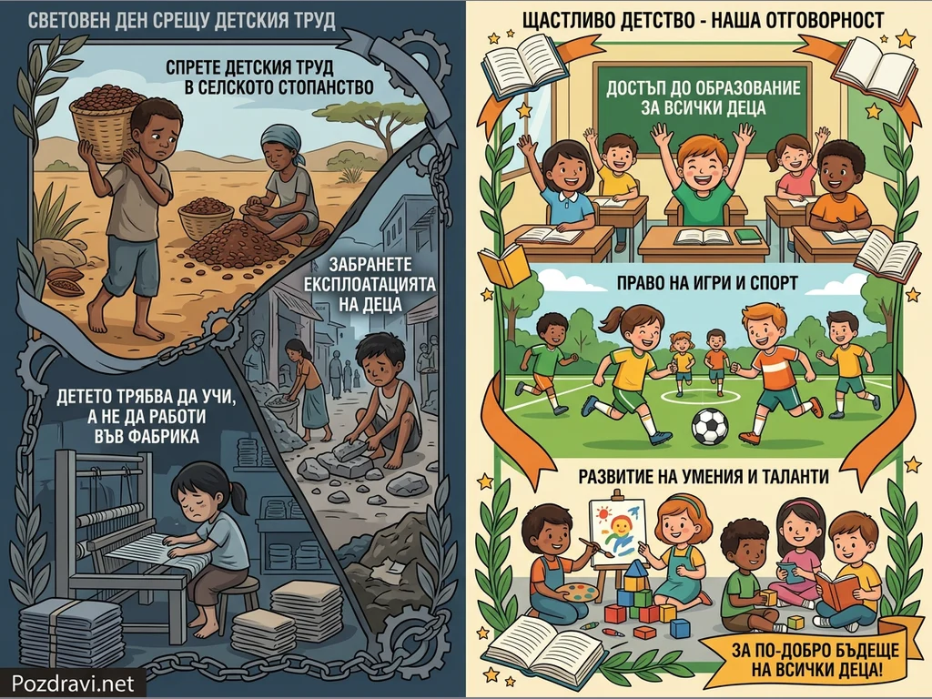 Изображението ярко противопоставя тежката реалност на детския труд с идеала за щастливо детство. На лявата страна, в мрачни тонове, са показани деца, принудени да работят в селското стопанство, строителството и фабрики, символизирано от вериги и зъбни колела. Текстовете призовават за спиране на детския труд и забрана на експлоатацията, подчертавайки, че децата трябва да учат. В дясната, светла част, са изобразени щастливи деца, които учат в училище, играят футбол и развиват своите таланти чрез рисуване и четене, акцентирайки върху достъпа до образование и правото на игра за по-добро бъдеще.
