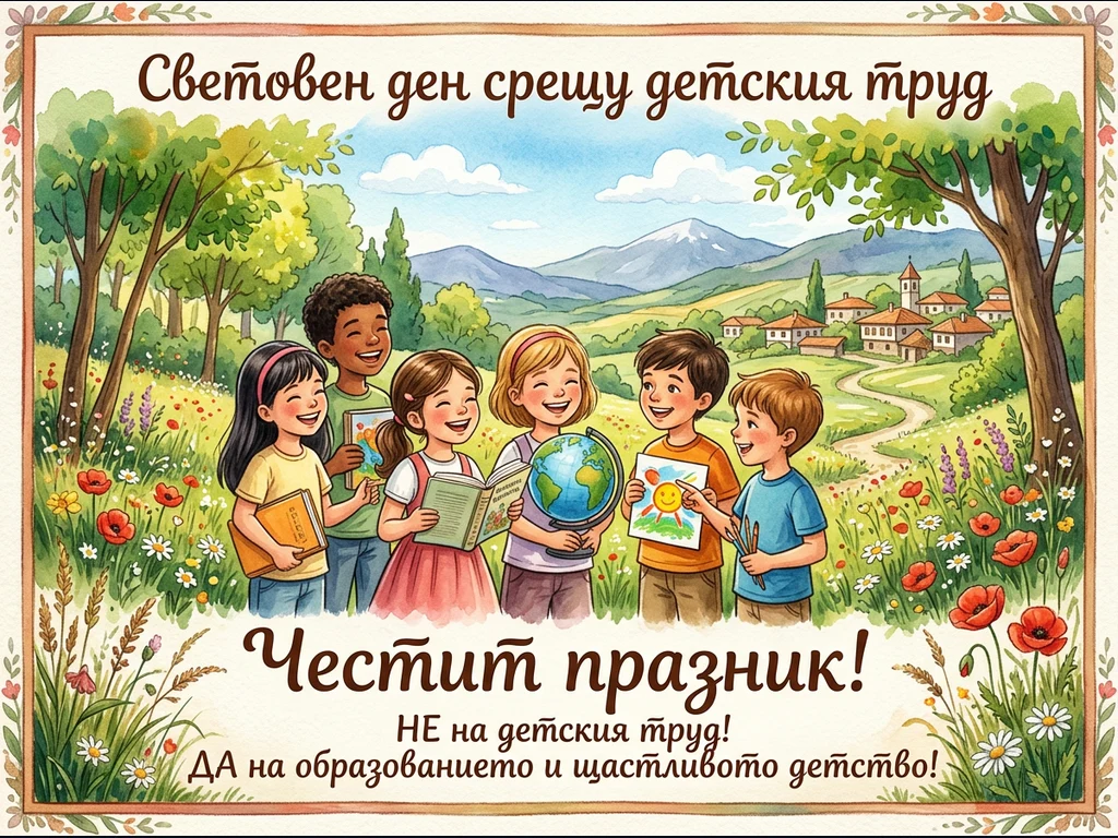 Тази акварелна илюстрация изобразява група от шест усмихнати деца от различни етноси, държащи книги, глобус и рисунки, символизиращи образованието и творчеството. Те са позиционирани на преден план в живописна поляна, осеяна с цветя и зеленина. На заден план се виждат тучни дървета, хълмове, традиционно българско село и заснежени планини под ясно синьо небе. Картичката носи посланието 'Световен ден срещу детския труд', 'Честит празник!', 'НЕ на детския труд! ДА на образованието и щастливото детство!', подчертавайки важността на щастливото детство и достъпа до образование.