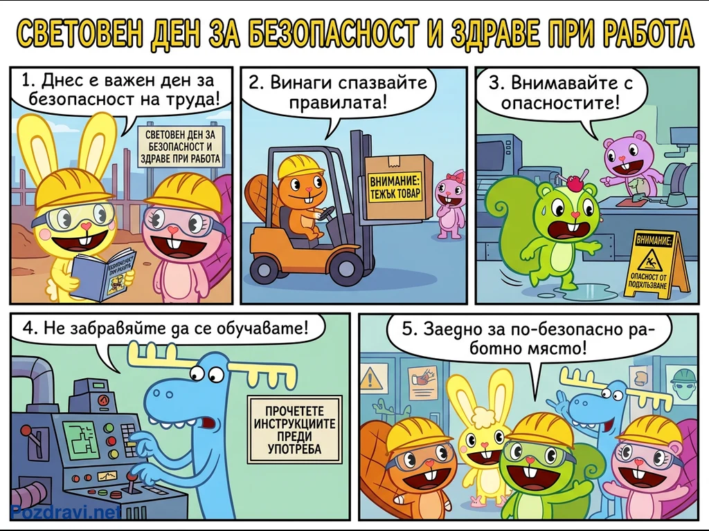 Карикатурата е разделена на пет панела, посветени на Световния ден за безопасност и здраве при работа, с герои от Happy Tree Friends. Всеки панел илюстрира ключов аспект на безопасността на труда, като спазване на правила, внимание към опасности и важността на обучението. Героите са показани с предпазни каски и очила, четат инструкции, управляват машини и избягват инциденти. Комиксът завършва с послание за колективна отговорност за създаване на по-безопасно работно място.