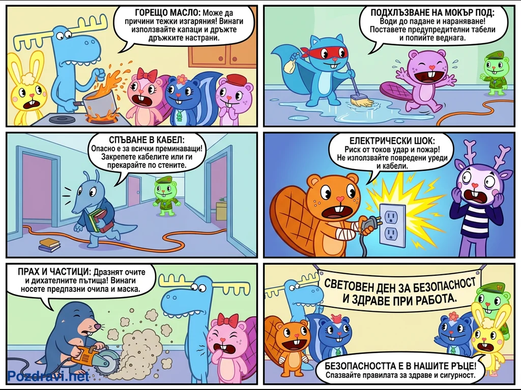 Цветен комикс с шест панела и анимационни герои илюстрира различни опасности на работното място. Всеки от първите пет панела показва често срещан риск като горещо масло, мокър под, разхлабени кабели, електрически шок и прах, придружен от ясно предупреждение и съвет на български език. Последният панел отбелязва 'Световен ден за безопасност и здраве при работа', подчертавайки, че безопасността е отговорност на всеки. Комиксът използва хумор и познати ситуации, за да информира за важни практики за здраве и безопасност.