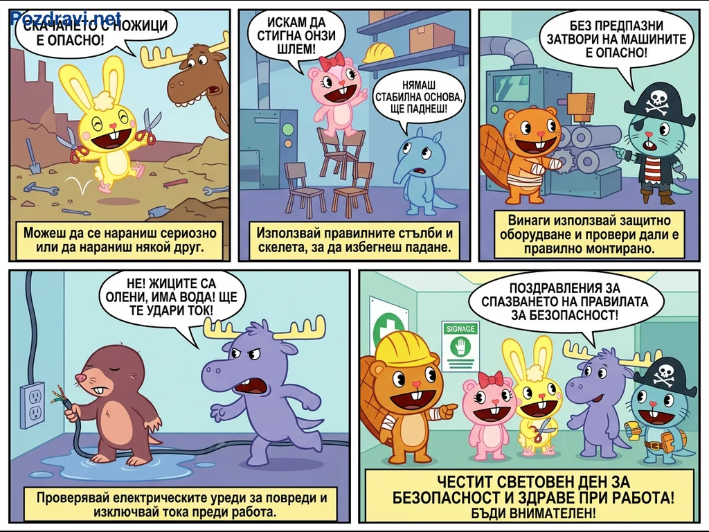 Комиксът от шест панела показва различни сценарии, свързани с безопасността на работното място, представени от анимирани животински герои. Всеки панел илюстрира потенциална опасност, като скачане с ножици, използване на нестабилни импровизирани стълби или работа с повредени електрически уреди. Придружаващият текст предупреждава за рисковете и дава съвети за правилното и безопасно поведение. Целта е да се подчертае важността на спазването на правилата за безопасност и използването на подходящо оборудване. Последният панел поздравява за спазването на тези правила и отбелязва Световния ден за безопасност и здраве при работа.