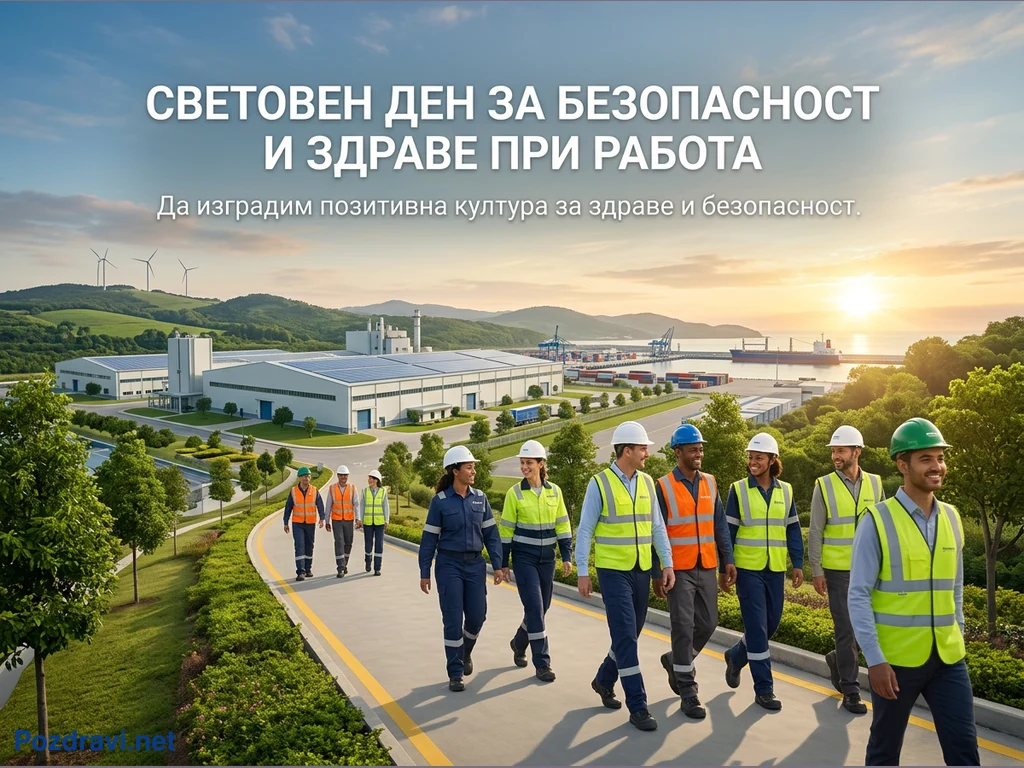 Група от усмихнати работници в предпазно облекло, включително каски и светлоотразителни жилетки, вървят по път в индустриален комплекс. На заден план се виждат модерни производствени сгради със соларни панели, вятърни турбини на зелени хълмове и пристанище с кораби и контейнери. Слънцето залязва или изгрява над морето, осветявайки пейзажа с топла светлина. Надписът 'СВЕТОВЕН ДЕН ЗА БЕЗОПАСНОСТ И ЗДРАВЕ ПРИ РАБОТА' и призивът 'Да изградим позитивна култура за здраве и безопасност' подчертават темата за безопасността на труда.