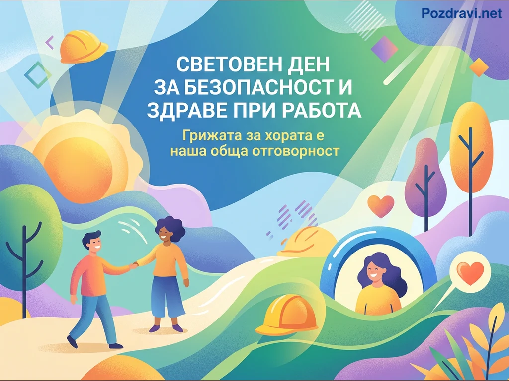 Тази цветна илюстрация изобразява живописен пейзаж с вълнообразни хълмове, дървета и ярко слънце, символизиращо нов ден. В центъра двама души си стискат ръце, подчертавайки сътрудничеството и общата отговорност. Жълти строителни каски са разпръснати из сцената, акцентирайки върху безопасността на работното място. Вдясно усмихнато женско лице е изобразено в защитна арка, символизираща благополучие. Надписът 'СВЕТОВЕН ДЕН ЗА БЕЗОПАСНОСТ И ЗДРАВЕ ПРИ РАБОТА' и 'Грижата за хората е наша обща отговорност' ясно комуникира посланието на плаката.