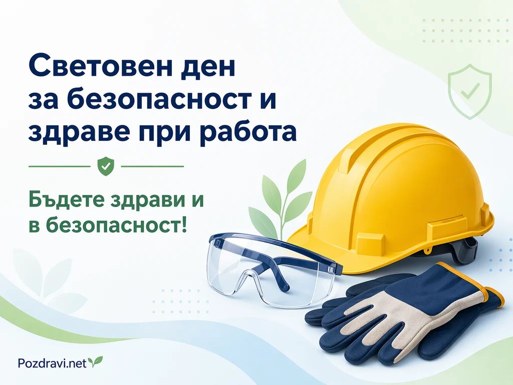 На светъл фон с меки зелени и сини вълни е оформена картичка с тема за безопасност на труда. Вляво е изписано 'Световен ден за безопасност и здраве при работа', а под него стои посланието 'Бъдете здрави и в безопасност!'. Около текста има малки иконки на щит с отметка, които подсилват усещането за защита и сигурност. Вдясно са показани лични предпазни средства: жълта защитна каска, прозрачни предпазни очила и чифт работни ръкавици в тъмносиньо и бежово. Зад предметите се виждат стилизирани зелени листа, които добавят асоциация със здраве и грижа. Декоративни точки и плавни цветови преливки придават модерен, чист и професионален вид на композицията.