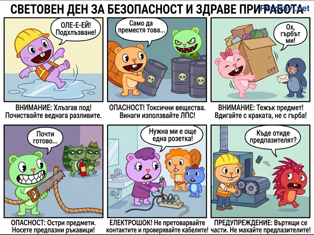 Комиксът представя различни опасности и добри практики за безопасност и здраве при работа, отбелязвайки Световния ден по темата. В шест отделни панела, анимирани герои демонстрират ситуации като хлъзгане на мокър под, преместване на токсични вещества без ЛПС и неправилно вдигане на тежки предмети. Други сцени включват работа с остри инструменти без ръкавици, претоварване на електрически контакти и боравене с машини без предпазители. Под всяка илюстрация е дадено конкретно предупреждение или съвет, подчертаващ важността на предпазните мерки и правилното поведение в работна среда.