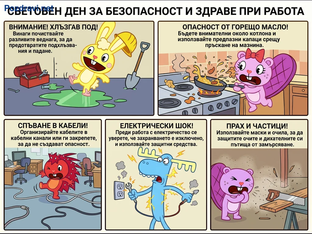 Плакатът отбелязва Световния ден за безопасност и здраве при работа, като използва популярни анимационни герои за илюстриране на често срещани опасности. Той показва пет различни сценария: хлъзгав под, пръски от горещо масло, спъване в кабели, електрически шок и вдишване на прах. Всяка сцена е придружена от предупреждение и конкретен съвет за предотвратяване на инциденти. Този нагледен материал ефективно комуникира важността на превенцията и използването на защитни средства в работна среда.