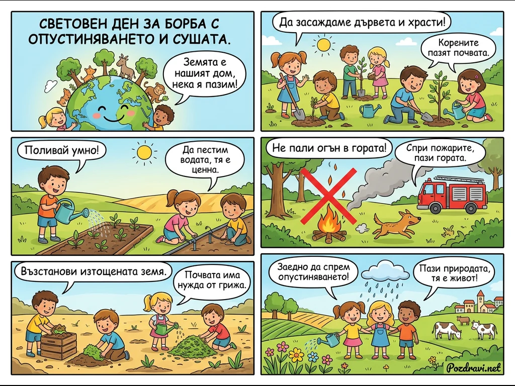 Цветен комикс от шест панела илюстрира различни начини за борба с опустиняването и сушата. Деца участват в дейности като засаждане на дървета, умно поливане, компостиране и предотвратяване на горски пожари. Всеки панел предава ясно послание за опазване на Земята, пестене на вода и възстановяване на почвеното здраве. Комиксът подчертава колективната отговорност и действията, необходими за опазване на природата и осигуряване на устойчиво бъдеще.