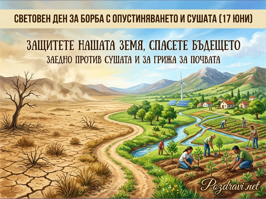 Картината ярко противопоставя опустошен, сух пейзаж отляво на плодородна, зелена долина отдясно. Лявата част показва напукана земя, изсъхнали храсти и мъртво дърво под прашно небе, символизиращи суша и опустиняване. Отдясно се вие река през обработваеми земи, където хора засаждат фиданки и се грижат за реколтата. В далечината се виждат зелени планини, вятърна турбина и соларни панели, подчертаващи устойчивото развитие. Надписът призовава за защита на Земята и бъдещето чрез борба със сушата и грижа за почвата, отбелязвайки Световния ден на 17 юни.