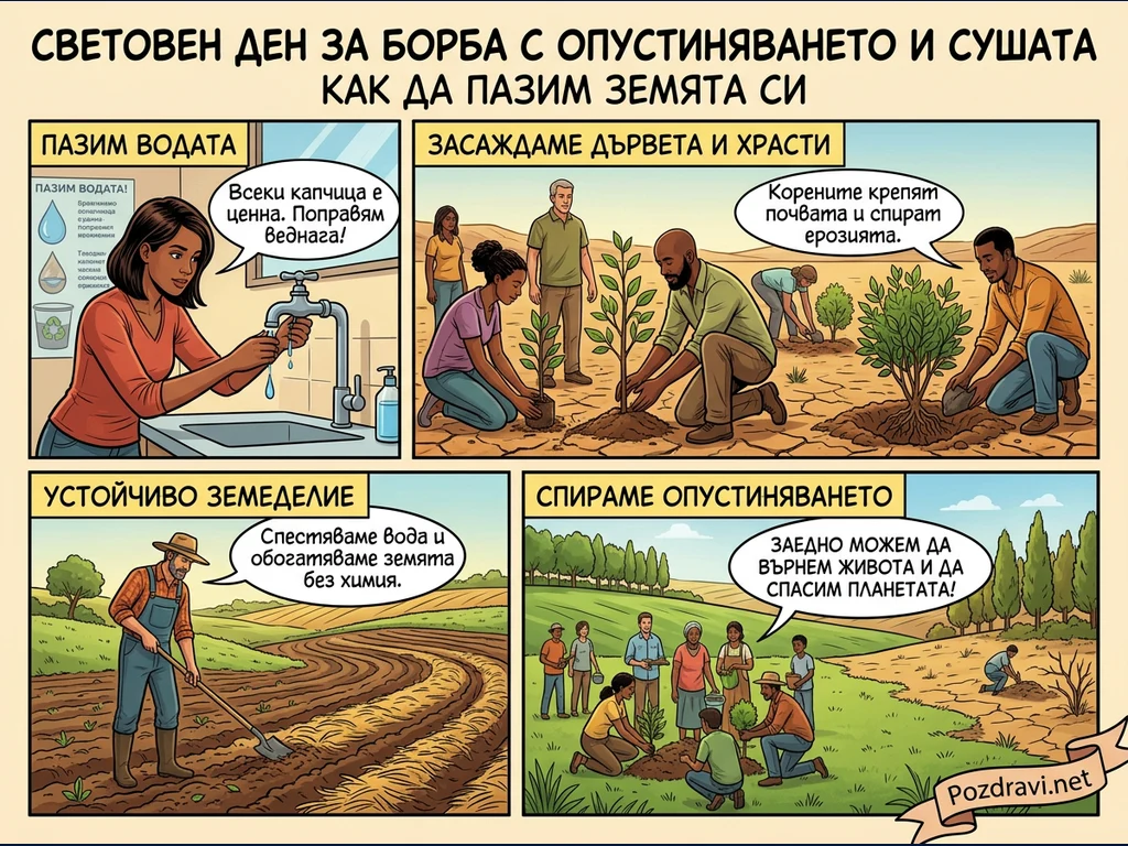 Ключови фрази: Борба с опустиняването, Пестене на вода, Засаждане на дървета, Устойчиво земеделие, Спасяване на планетата