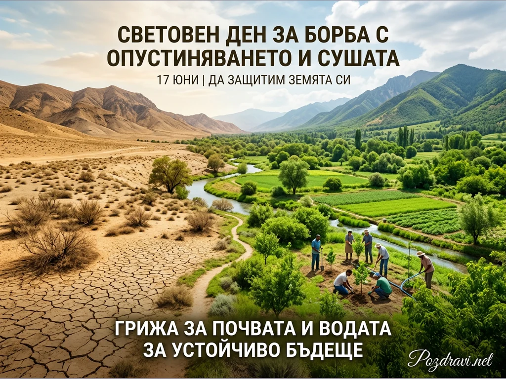 Картината драматично противопоставя суха, напукана пустинна земя отляво на буйна, зелена долина с течаща река отдясно. Планини се издигат величествено от двете страни на пейзажа. В зелената част група хора активно засаждат дръвчета край реката, символизирайки усилия за възстановяване. Текстът отгоре отбелязва Световния ден за борба с опустиняването и сушата на 17 юни, призовавайки за грижа за почвата и водата за устойчиво бъдеще.