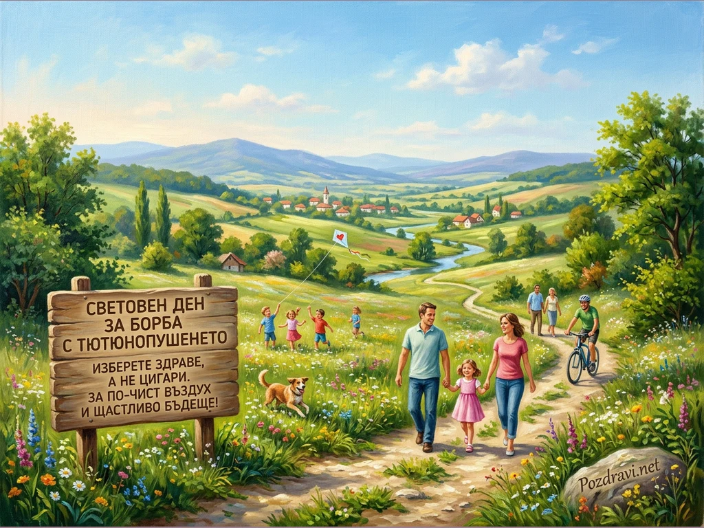 Тази живописна картина изобразява идиличен пейзаж с тучни зелени хълмове, виеща се река и малко село в далечината под ясно синьо небе. На преден план, по камениста пътека, върви усмихнато семейство – баща, майка и малко момиченце, държащи се за ръце. Около тях играят деца с хвърчило, тича куче, а други хора се разхождат или карат колело, наслаждавайки се на природата. Вляво е поставен дървен знак с надпис 'СВЕТОВЕН ДЕН ЗА БОРБА С ТЮТЮНОПУШЕНЕТО. ИЗБЕРЕТЕ ЗДРАВЕ, А НЕ ЦИГАРИ. ЗА ПО-ЧИСТ ВЪЗДУХ И ЩАСТЛИВО БЪДЕЩЕ!', който подчертава посланието за здравословен живот. Цялостната атмосфера е изпълнена с радост, спокойствие и призив за живот без тютюнопушене сред чиста природа.