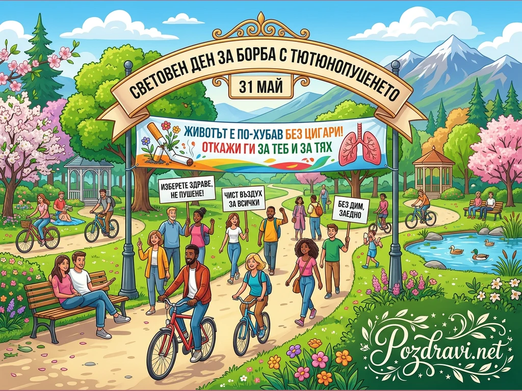 Тази цветна илюстрация в анимационен стил изобразява оживен парк, изпълнен с хора, наслаждаващи се на здравословен начин на живот. На преден план група хора вървят и карат велосипеди, като някои от тях държат плакати с послания против тютюнопушенето. Над тях се издига голям транспарант, обявяващ 'Световен ден за борба с тютюнопушенето 31 май', а под него друг банер призовава: 'Животът е по-хубав без цигари! Откажи ги за теб и за тях', илюстриран с цъфтяща цигара и здрави бели дробове. Паркът е осеян с цъфтящи дървета, езерце с патици и беседки, а на хоризонта се виждат планини, символизиращи чиста природа. Цялостната сцена предава позитивно послание за отказване от тютюнопушенето и избор на по-здравословен и щастлив живот.