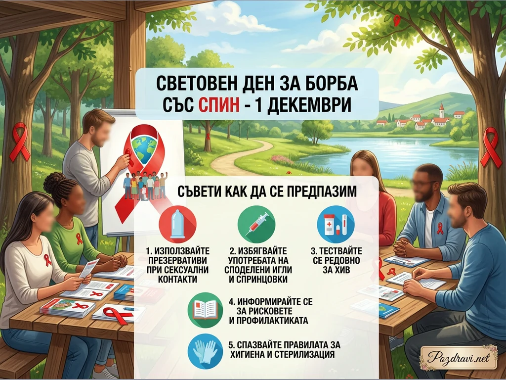 На картината е показана група от хора, събрани на открито, вероятно в парк край езеро, за да обсъдят превенцията на ХИВ/СПИН. Мъж посочва бяла дъска с червена панделка, символ на борбата със СПИН, и илюстрация на хора около земното кълбо. На преден план са разположени две маси, на които седят хора, обменящи информация и материали, включително брошури и червени панделки. В горната част на изображението е изписано 'СВЕТОВЕН ДЕН ЗА БОРБА СЪС СПИН - 1 ДЕКЕМВРИ', а под него са изброени пет съвета за предпазване. Обстановката е спокойна, с дървета, езеро и къщи на заден план, като по дърветата също има червени панделки.