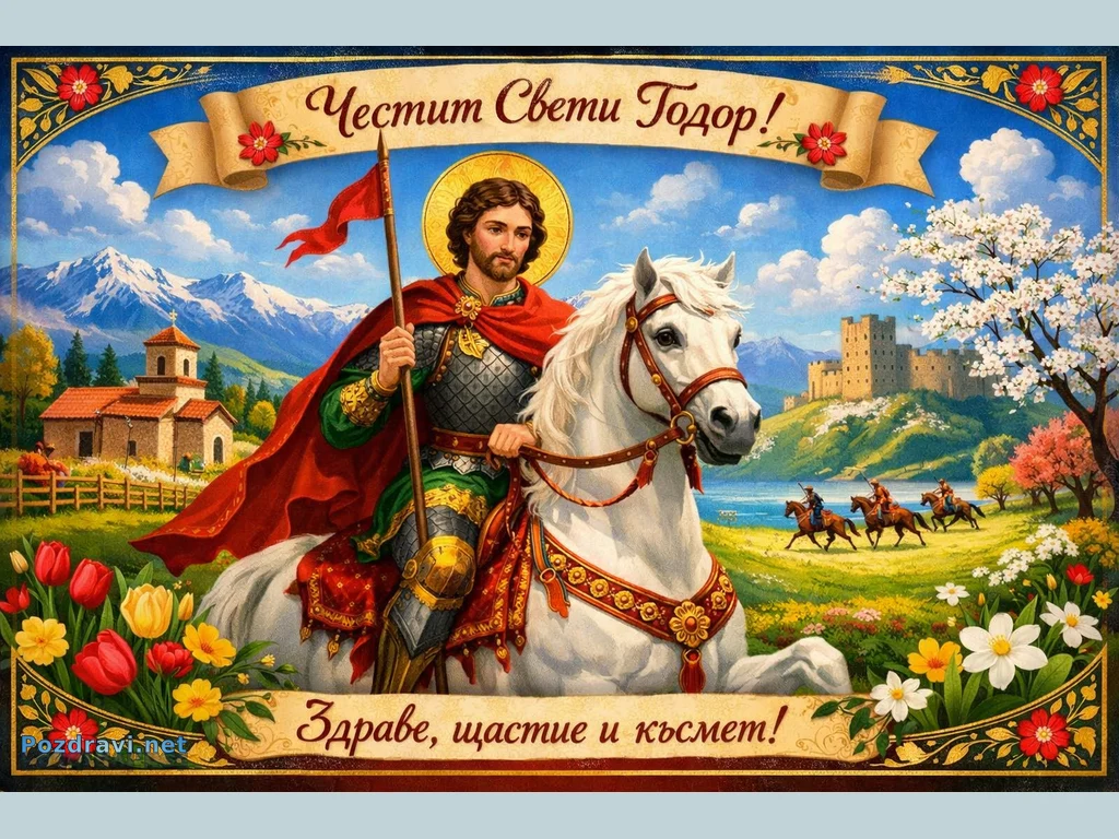 Ключови фрази: картичка Свети Тодор, Тодоровден поздрав, българска празнична картичка, светец на кон, честит Тодоровден