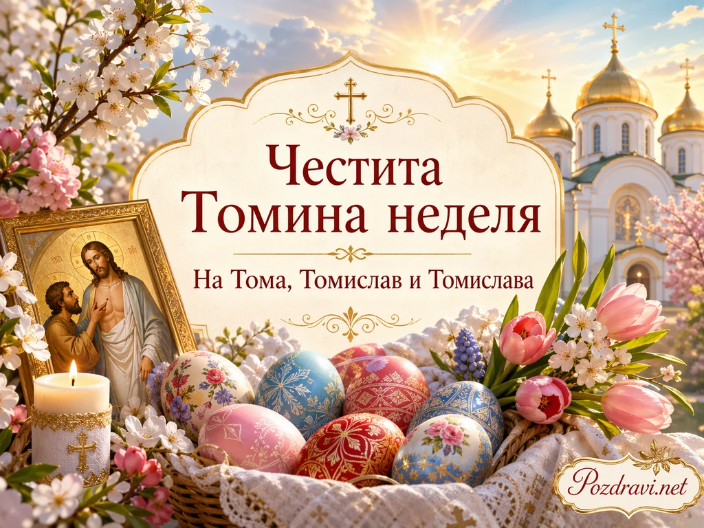 В центъра има елегантен светъл декоративен панел с златни орнаменти и кръст, а върху него е изписано 'Честита Томина неделя'. Под основния надпис стои текстът 'На Тома, Томислав и Томислава', който насочва към имен ден и православен празник. На преден план се вижда кошница с богато украсени великденски яйца в различни цветове и шарки, подредени върху бяла дантела. Вляво е поставена икона с религиозен сюжет и запалена свещ, които подсилват тържественото и духовно усещане. Около композицията има цъфнали пролетни клони, лалета и нежни цветя, които придават свежест и празнична мекота. На заден план се издига православен храм със златни куполи под сияйно слънце, а цялата сцена носи топла, светла и благоговейна атмосфера.