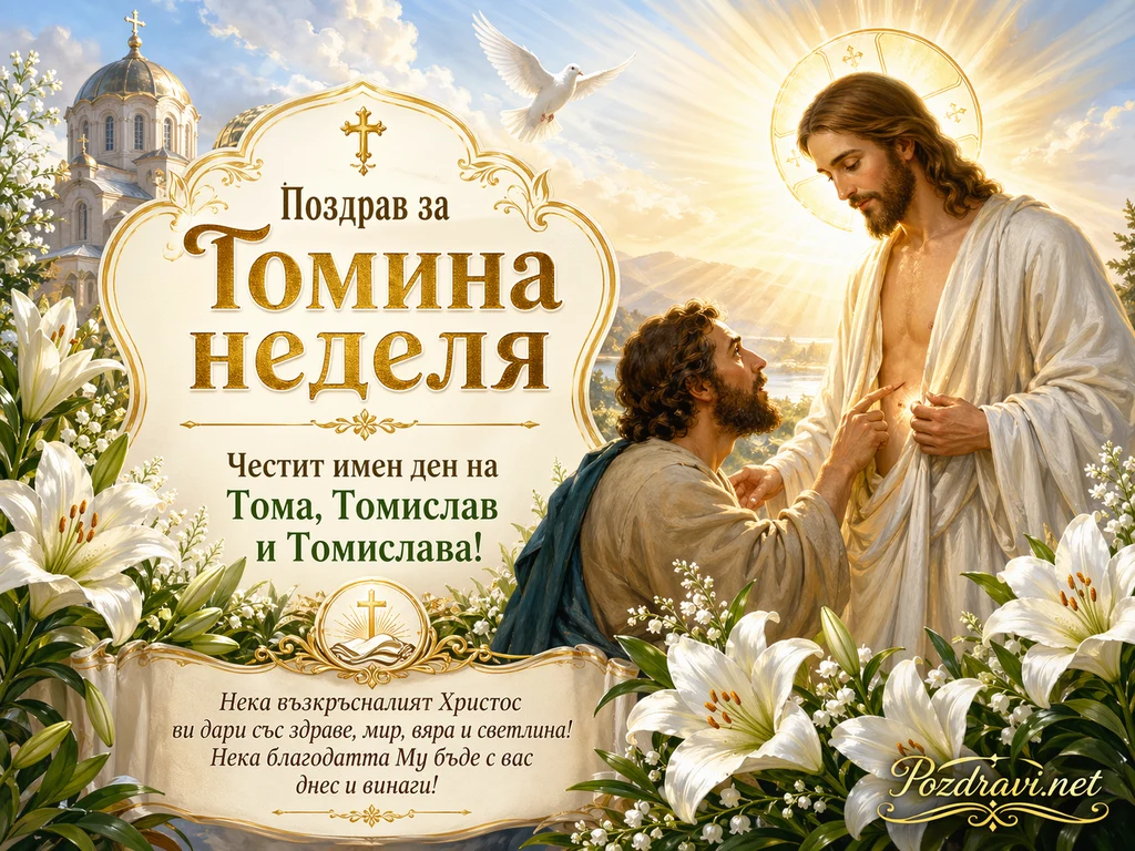 Картичката е в православен празничен стил, с богати златни орнаменти и светла небесна гама. В центъра е оформен декоративен панел с надписите 'Поздрав за Томина неделя' и 'Честит имен ден на Тома, Томислав и Томислава!', изписани с елегантни шрифтове. Горе вдясно е изобразен Христос с сияен ореол, дълга светла дреха и мек поглед, насочен към апостол Тома. Апостол Тома е коленичил пред Него и докосва гърдите Му, което напомня за евангелската сцена на разпознаването. На заден план се виждат църква с куполи, разтворено небе, златни слънчеви лъчи и летящ бял гълъб, а по краищата има големи бели лилии и зелени листа. В долната част стои благословът 'Нека възкръсналият Христос ви дари със здраве, мир, вяра и светлина! Нека благодатта Му бъде с вас днес и винаги!', който завършва композицията тържествено.