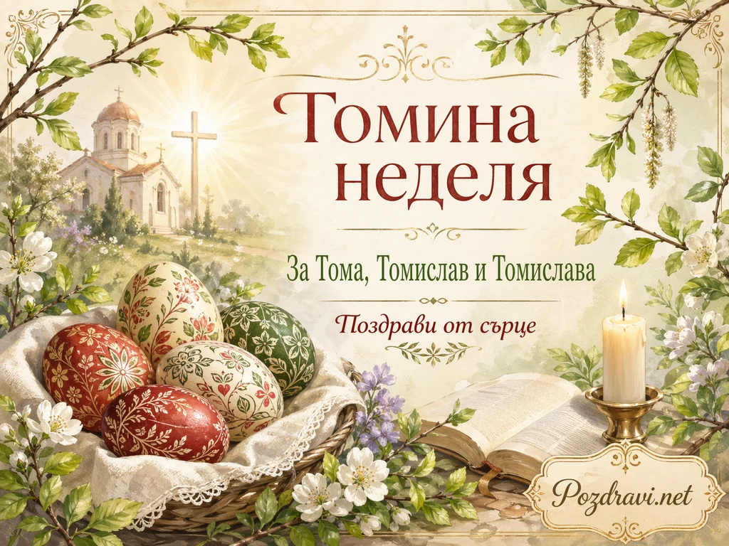 В центъра стои надписът 'Томина неделя', изписан в тъмночервен цвят и обграден от фини декоративни орнаменти. Под него се вижда текстът 'За Тома, Томислав и Томислава', а по-надолу е добавено 'Поздрави от сърце'. Около надписите композицията е богата на пролетни и православни мотиви, с разцъфнали клонки, бели цветове и мека златиста светлина. Вляво има малка църква с кръст и сияещ кръст отпред, които подсилват духовното и празнично усещане. В долната лява част е подредена кошница с шарени великденски яйца, украсени в червено, зелено и кремаво с изящни орнаменти. Вдясно са поставени отворена книга, наподобяваща Библия, и запалена свещ в златен свещник, които допълват тържествената и благоговейна атмосфера. Цялата сцена е мека, светла и живописна, с усещане за пролет, вяра и празнична топлота.