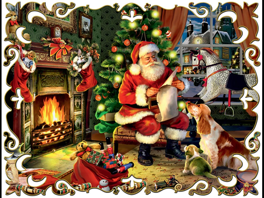 Ключови фрази: Честита коледа картичка пожелание поздрави подаръци домашен уют любимци кученца играчки украсена елха семейство дом горяща камина дъдо мраз