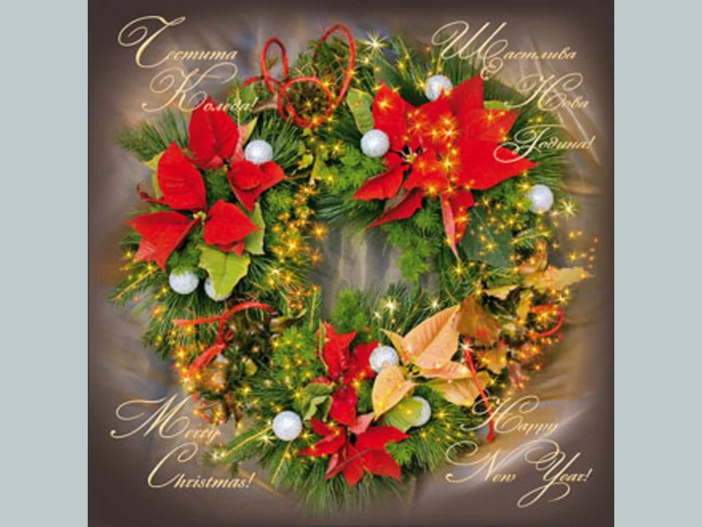 Ключови фрази: Коледен венец звездиборови клонки перлички пожелание поздрави весела коледа щастлива нова година