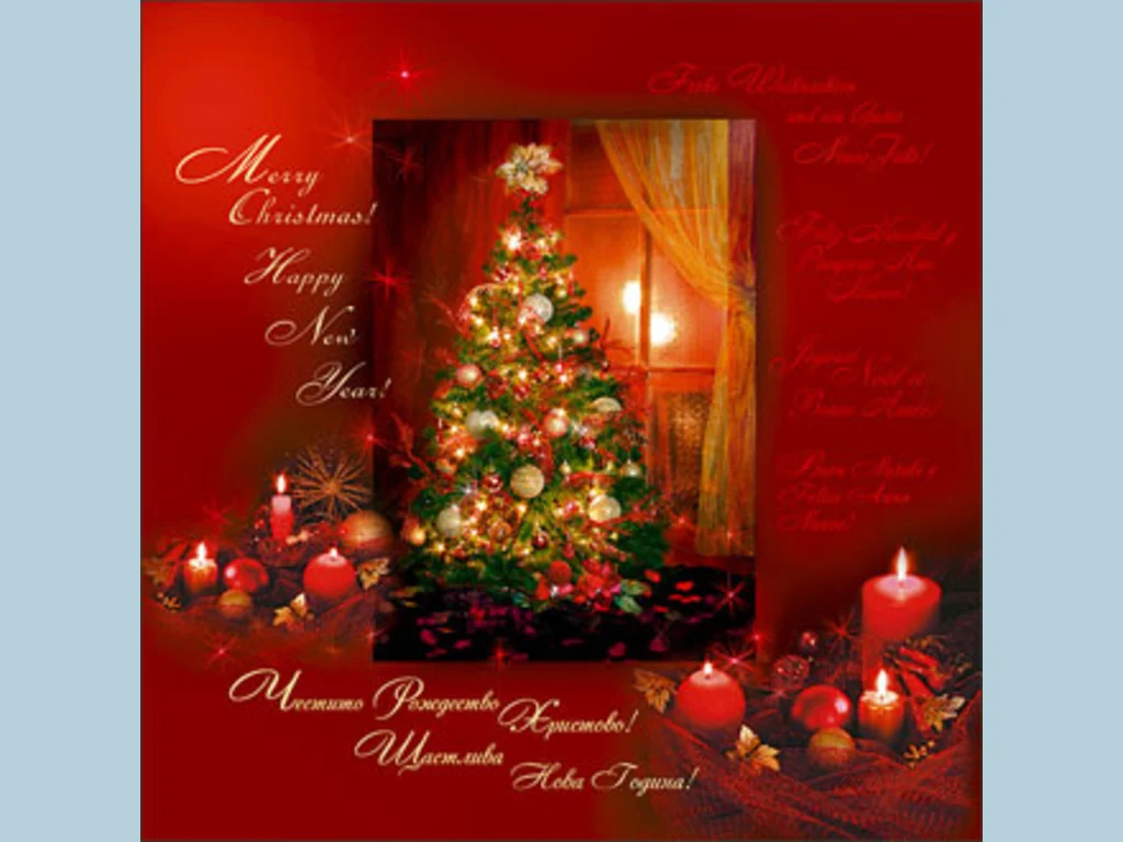 Ключови фрази: Картичка пожелание поздрави честито рождество Христово коледно новогодишни играчки украса елха клонки червени свещи пламъче панделка звездички любов късмет