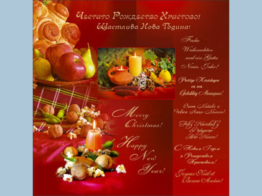 Ключови фрази: Картичка червено пожелание поздрави звездички борови клонки звездички пламъче свещ коледна погача богата коледна трапеза постни ястия