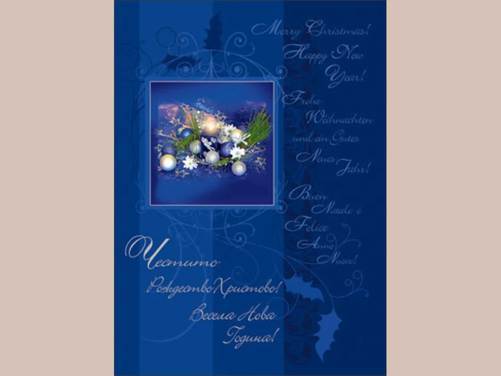 Ключови фрази: Картичка синьо коледна украса новогодишни играчки семпла борово клонче поздрави пожелания любов мир щастлив живот