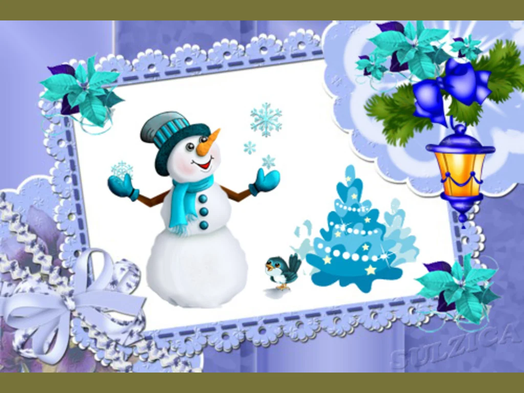 Ключови фрази: Рисувана картичка панделки Коледна звезда фенер цветя снежен човек снежинки пиленце празник пожелание здраве късмет любов