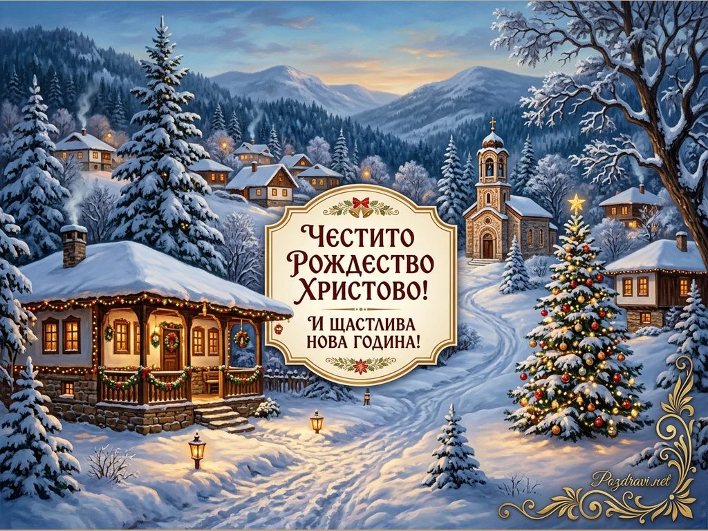 Тази празнична картичка изобразява идилично зимно село, покрито с пухкав сняг. Традиционни къщи с греещи прозорци и коледна украса са разположени сред заснежени борове, а от комините им се издига дим. Вдясно се вижда красива църква с камбанария и пищно украсена коледна елха със звезда на върха. Снежна пътека, осветена от фенери, преминава през пейзажа, водеща към далечни планини под мекото небе на здрача. В центъра е поставен надпис 'Честито Рождество Христово! И щастлива Нова Година!'.