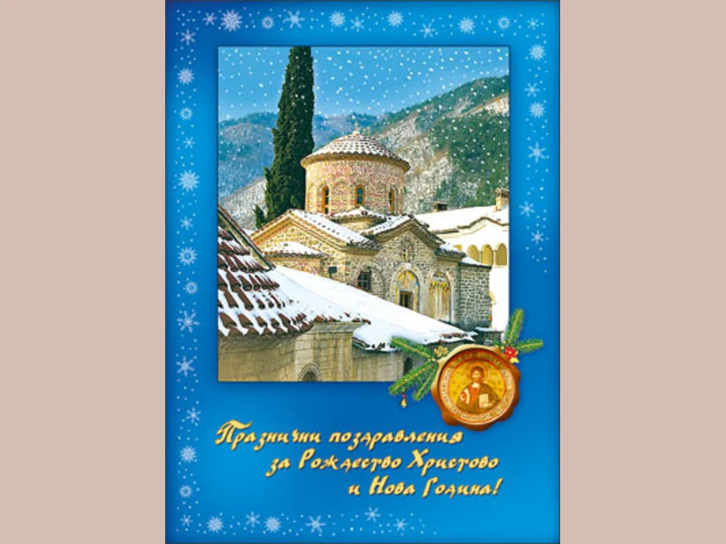 Ключови фрази: Картичка снежна снежинки църква манастир зимен пейзаж пожелание поздрави празник Рождество Христово