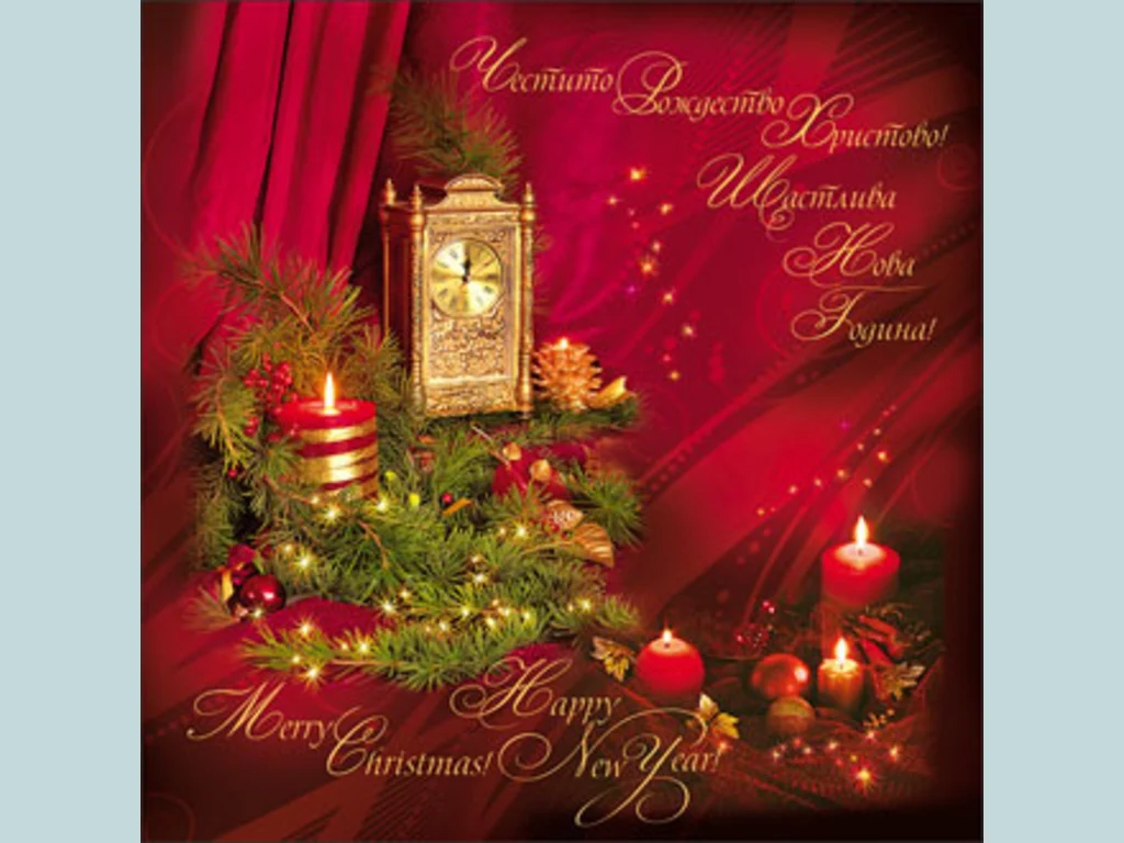 Ключови фрази: Картичка пожелание поздрави коледно новогодишни играчки украса борови клонки червена свещ пламъче часовник панделка звездички любов късмет