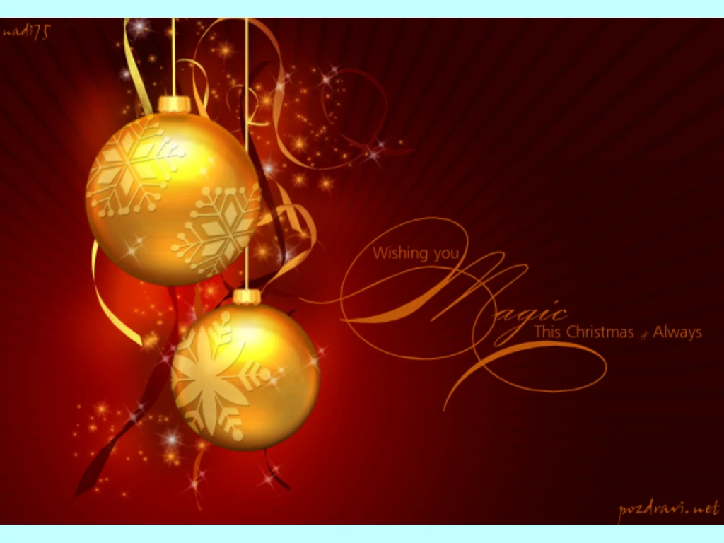 Ключови фрази: Картичка вишнево червена новогодишна коледна украса жълти играчки топки панделки звездички поздрави пожелание любов