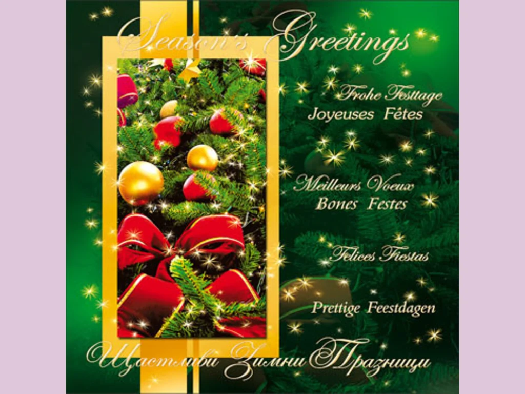 Ключови фрази: Картичка пожелание поздрави червена панделка борови клонки украса коледна играчки звездички светещи