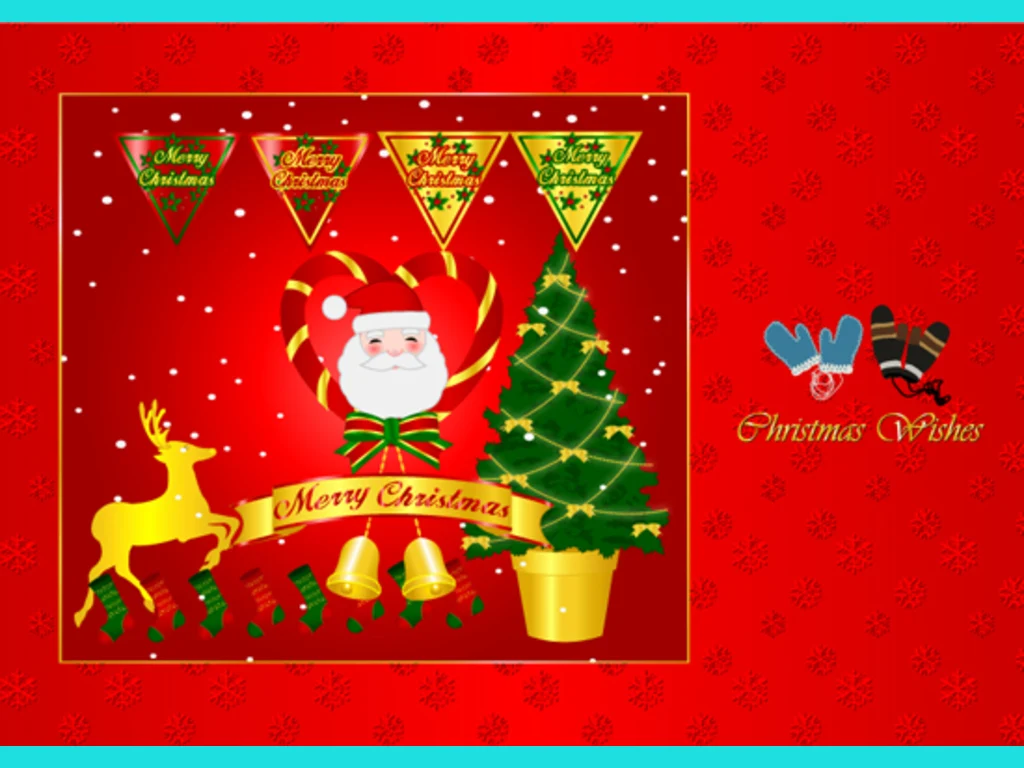 Ключови фрази: Картичка поздрав дядо коледа пълен чувал подаръци елен звездички снежинки изненади украса елха празник пожелание весела коледа здраве щастие пари