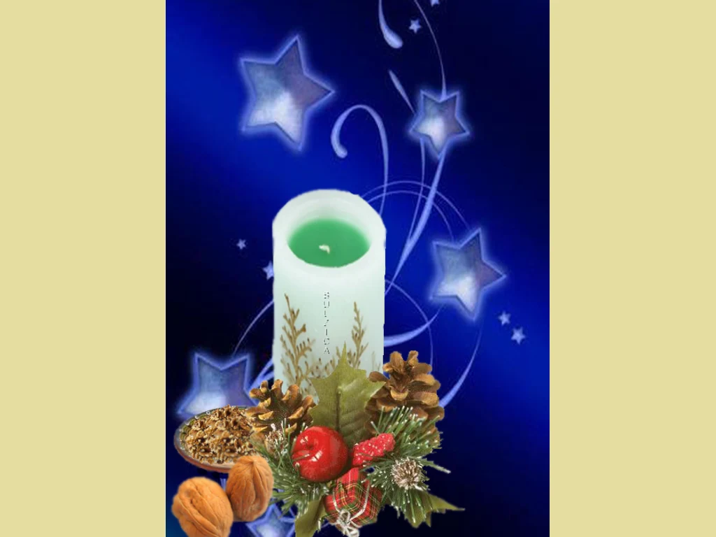 Ключови фрази: Картичка поздрави пожелание здраве благоденствие мир любов късмет орепи украса борови клонки шишарки звездички свещичка