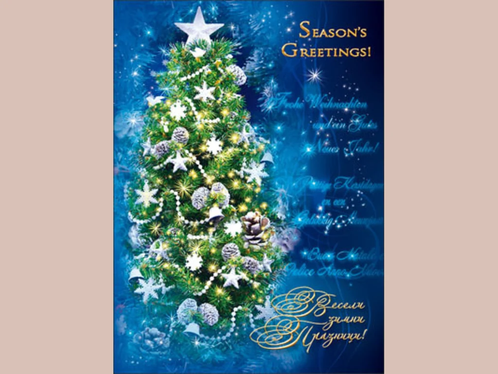 Ключови фрази: Картичка поздрави пожелание здраве щастие любов разбирателство украсена коледна красива светища елха бели герлянди звездички играчки