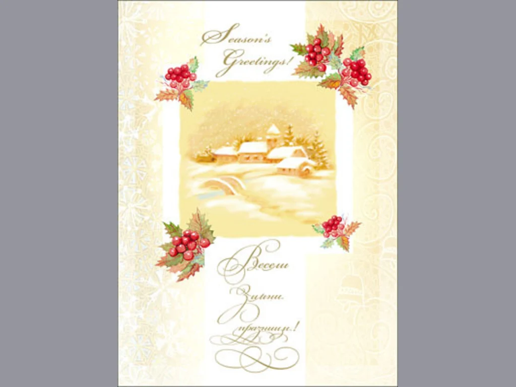 Ключови фрази: Картичка сгушени зима сняг къщички борове снежинки зимен пейзаж поздрави пожелание весели зимни празници
