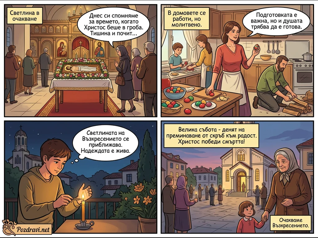 Комиксът представя Велика събота и очакването на Възкресение Христово чрез четири сцени. В църквата вярващи се покланят пред плащаницата, символизираща Христос в гроба, докато в домовете семействата се подготвят за празника, боядисвайки яйца. С настъпването на нощта, млад мъж запалва свещ, изразявайки живата надежда за идващата светлина. Накрая, хора с кандила се събират пред храма, готови да посрещнат радостта от победата на Христос над смъртта.