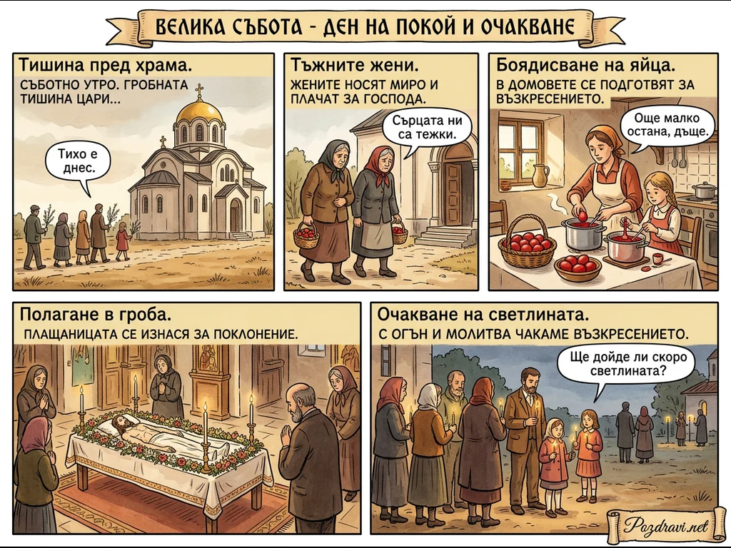 Комиксът илюстрира различни аспекти на Велика събота, ден на покой и очакване преди Великден. Панелите показват хора в тишина пред храм, тъжни жени, носещи миро, и семейство, което боядисва червени яйца вкъщи. В църквата вярващи се покланят пред плащаницата, символизираща полагането на Христос в гроба. С настъпването на вечерта, хора с горящи свещи стоят навън, очаквайки Светата Светлина и радостта от Възкресението. Всички сцени отразяват дълбоката духовна атмосфера и подготовката за най-големия християнски празник.