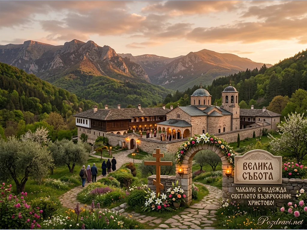 Ключови фрази: Велика събота, православен манастир, великденски поздрав, пролетен пейзаж, християнски празник