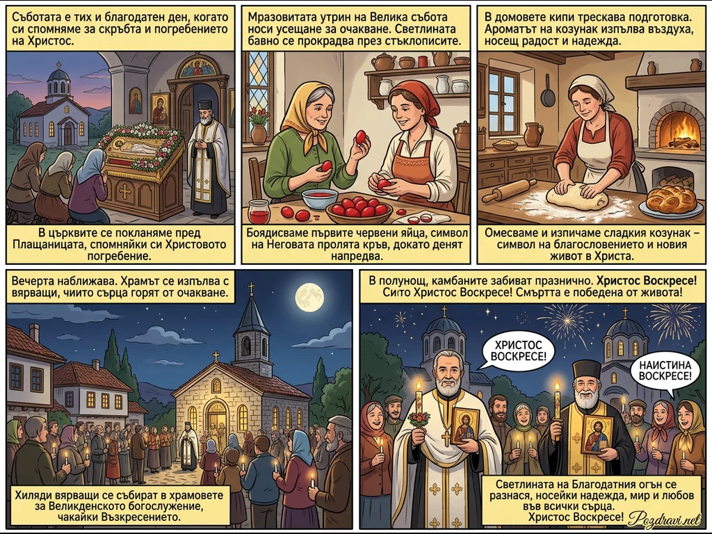 Комиксът илюстрира последователността на събитията и традициите около Великден. Започва с поклонение пред Плащаницата в църква на Велика събота, след което показва боядисване на червени яйца и месене на козунаци в домовете. Вечерта вярващи се събират пред храма със свещи, очаквайки Възкресението. Кулминацията е полунощната служба, където свещеници и хора празнуват с радост и Благодатен огън, възвестявайки 'Христос Воскресе!'.