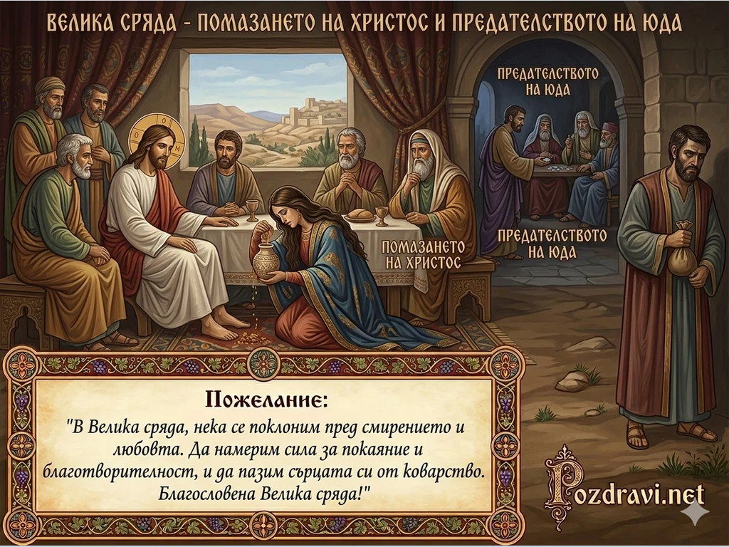 Тази православна икона, оформена като празнична картичка, изобразява две ключови събития от Страстната седмица, случили се на Велика сряда. Основната сцена в центъра е 'Помазанието на Христос', където жена коленичи и излива миро върху нозете на Исус в дома на фарисея Симон, в присъствието на апостолите. Отдясно, в отделна арка, е показано 'Предателството на Юда', където той получава сребърниците от първосвещениците. В горната част има надпис на български: 'ВЕЛИКА СРЯДА - ПОМАЗАНЕТО НА ХРИСТОС И ПРЕДАТЕЛСТВОТО НА ЮДА', а под сцените са посочени 'ПОМАЗАНЕТО НА ХРИСТОС' и 'ПРЕДАТЕЛСТВОТО НА ЮДА'. Долу, в красива орнаментирана рамка, е поместено пожелание на български: 'Пожелание: 'В Велика сряда, нека се поклоним пред смирението и любовта. Да намерим сила за покаяние и благотворителност, и да пазим сърцата си от коварство. Благословена Велика сряда!''.