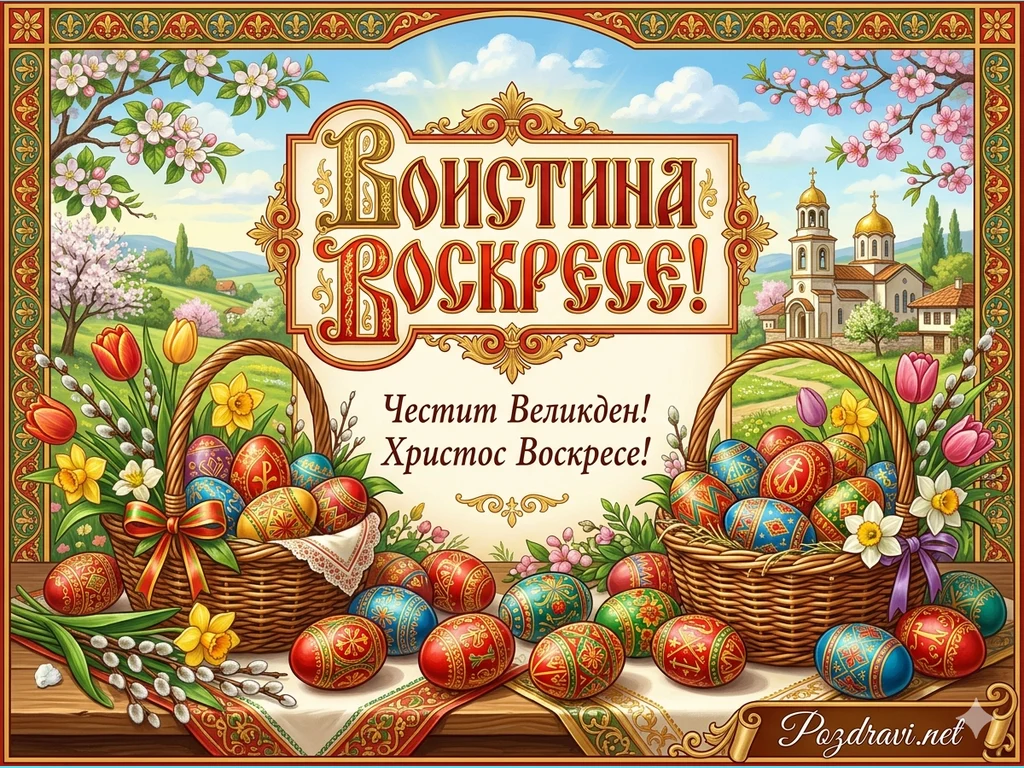 Тази красива Великденска картичка в пейзажно оформление прелива от празнично настроение и традиционна символика. В централната част, в изящна декоративна рамка, е поставен големият и богато украсен надпис 'ВОИСТИНА ВОСКРЕСЕ!', изпълнен с внимание към детайла в характерния за Великден стил.