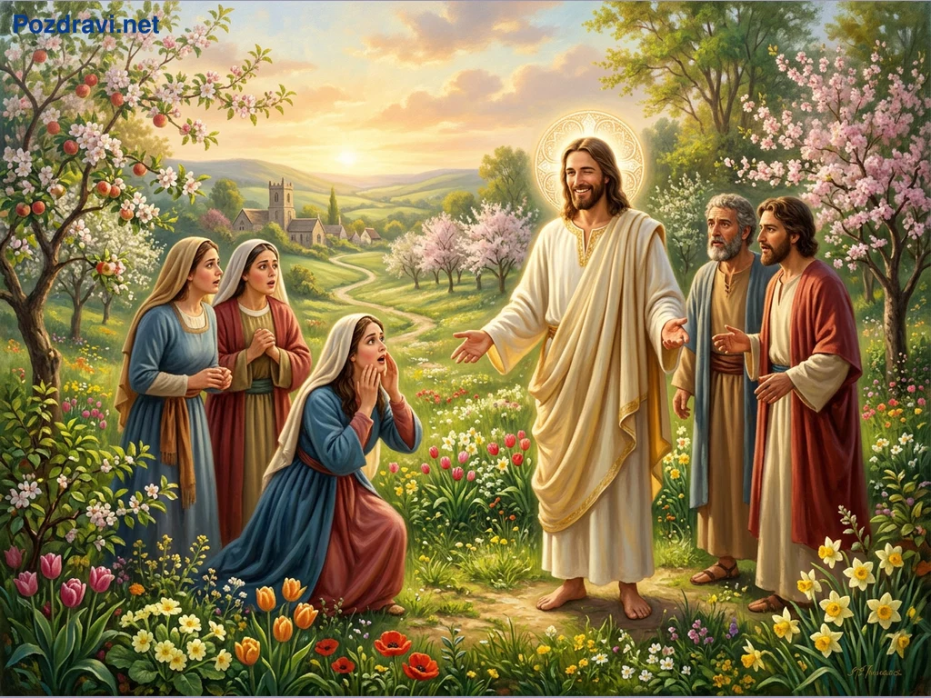 Ключови фрази: Исус Христос, библейска сцена, пролетна градина, религиозно изкуство, възкресение