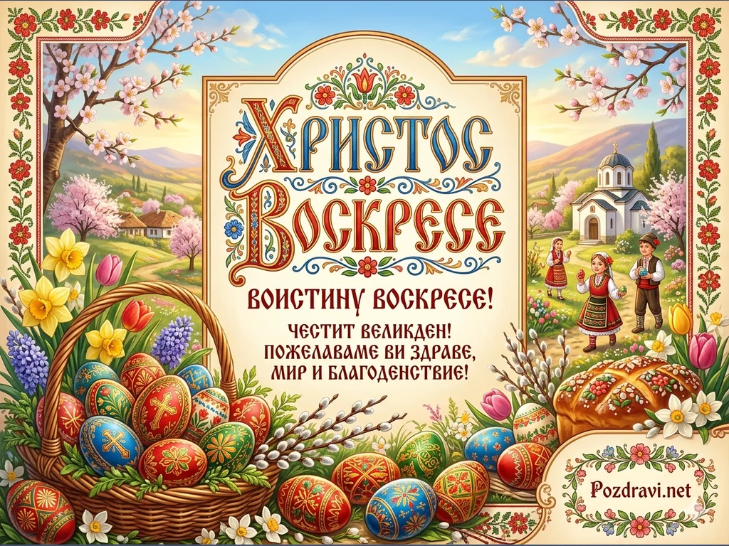 Тази красива Великденска картичка в пейзажно разположение излъчва радост и пролетно настроение. Централно място заема големият, изящно изрисуван надпис 'ХРИСТОС ВОСКРЕСЕ' в синьо и червено с прецизни златни орнаменти. Под него е разположен отговорът 'ВОИСТИНУ ВОСКРЕСЕ!', последван от сърдечни пожелания за здраве, мир и благоденствие по случай празника.