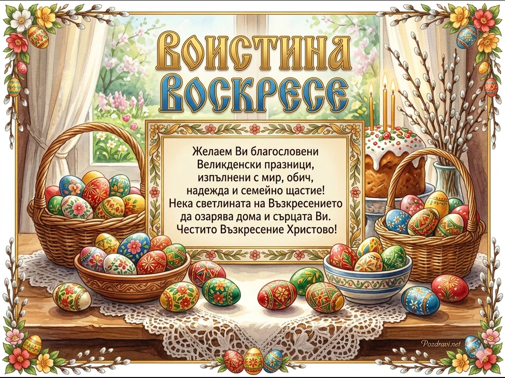 Тази красива Великденска картичка е изпълнена в топъл и празничен стил, съчетаващ традиционни мотиви с изящна композиция. В горната част на изображението с големи, богато украсени златни букви е изписан поздрава 'ВОИСТИНА ВОСКРЕСЕ', което веднага поставя акцента върху същността на празника. Под него, в декоративна рамка с нежни флорални мотиви, е поместено сърдечно пожелание, изпълнено с надежда и благослов: 'Желаем Ви благословени Великденски празници, изпълнени с мир, обич, надежда и семейно щастие! Нека светлината на Възкресението да озарява дома и сърцата Ви. Честито Възкресение Христово!'.