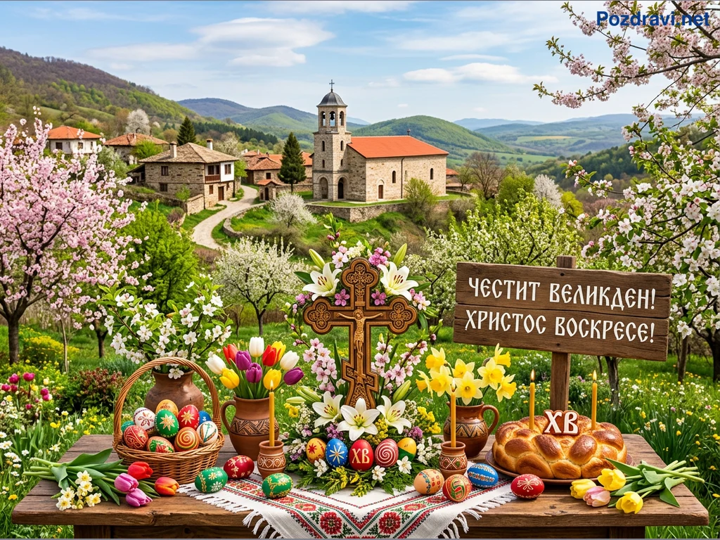 На преден план е аранжирана празнична великденска маса с традиционни елементи. В центъра ѝ стои дървен кръст, обсипан с бели лилии и розови цветя, заобиколен от ярко боядисани великденски яйца, козунак с инициалите 'ХВ' и свещи. Кошница с пъстри яйца, вази с лалета и нарциси, както и бродирана покривка допълват празничната атмосфера. На заден план се разкрива живописен пролетен пейзаж с традиционно българско село, църква с камбанария и цъфтящи дървета под ясно синьо небе. Дървена табела с надпис 'ЧЕСТИТ ВЕЛИКДЕН! ХРИСТОС ВОСКРЕСЕ!' допринася за празничното послание.