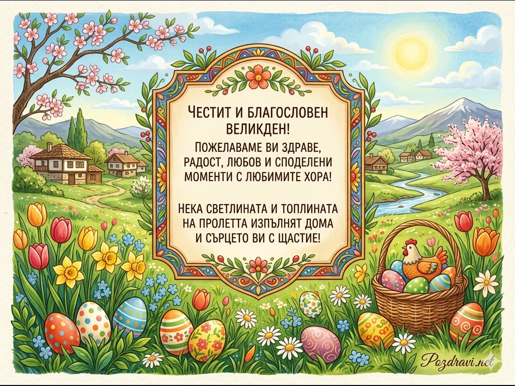 Тази очарователна великденска картичка е изпълнена в живописен, акварелен стил, пренасящ ни в идилична пролетна планинска местност. Централно място в композицията заема елегантна, декорирана рамка с изискани флорални мотиви, в която е изписано топло великденско пожелание на български език: