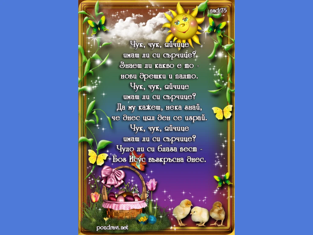 Детска великденска картичка с текста от детската великденска песничка на Дора Габе - Чук, чук, яйчице…